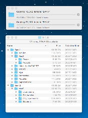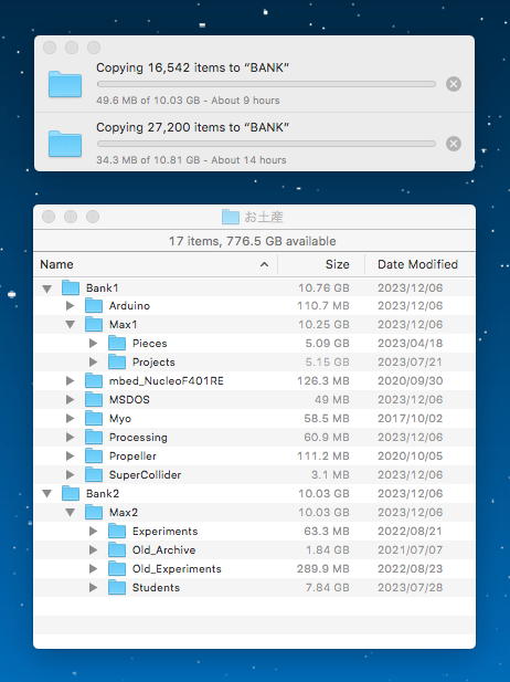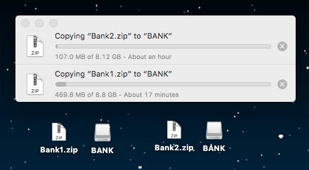 そして、全体をそれぞれ約10GBとした2つのディレクトリから2枚のSDHCカードにコピーを開始してみると、内部的に数万ファイルあるためか、上のようになんとも現実的でない転送時間となる事が判明した。 そこで今度は、「お土産」ディレクトリ内のBank1とBank2のそれぞれのディレクトリをzipの1ファイルに固めてみると、サイズが8GB台にまで圧縮された。 ところがこれをSDHCメモリカードにコピーしようとするとエラーが出て、そこで「MS-DOS(FAT)」の1ファイルの最大サイズに2GBの限界があることを思い出したので、再度Disk Utilityで「ExFAT」でフォーマットしてみると、今度はようやく以下のようにそこそこの時間で出来ると判明した。