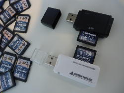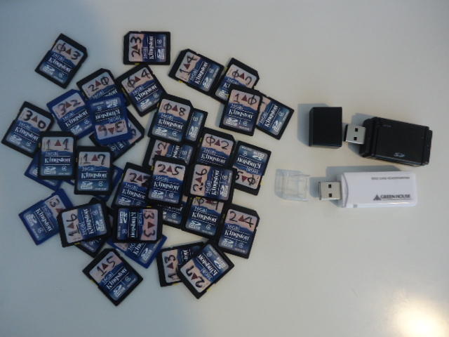 - お土産は2枚のSDHCカードですので、上のように対応した「SDHCカードリーダ(アダプタ)」で読み込んで下さい