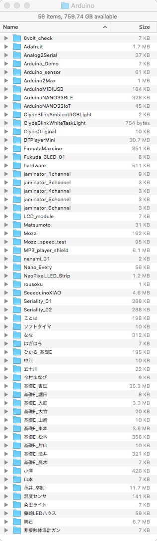 - 上の「Arduino」ディレクトリでは、基本的に「Arduinoの実験」・「Arduinoスタンドアロン」というプロジェクトが並んでいます。それぞれ、該当する周辺ボードやライブラリなどの情報は自己責任でゲットして下さい