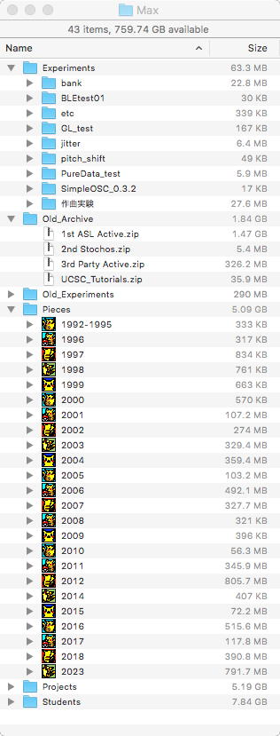- 上の「Max」ディレクトリ下の「Old_Archiveディレクトリ」では、もっとも古いMax関係をそれぞれzipにしています。「1st ASL Active」は1990年代のもの、「2nd Stochos」は2001年にパリのStudio MOTUSでゲットしたもの、「3rd Party」は得体の知れない拾いもの、「UCSC_Tutorials」はカーティス・ローズの教科書です