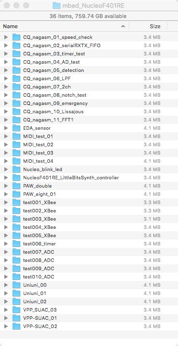 - 上の「mbed_NucleoF401RE」ディレクトリには、Armのmbed NucleoF401REで実験/開発した全てのソースがあります。IDEはオンラインでもスタンドアロンでも動作を確認しています