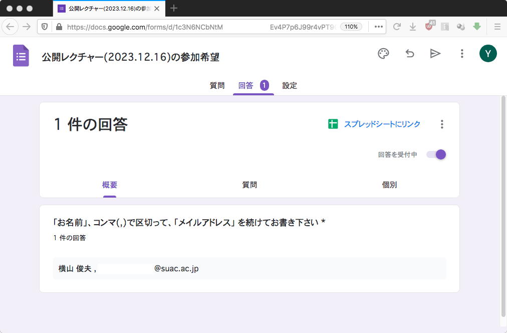 朝イチで Final Lecture/Workshop by YN の Googleフォーム を調べてみると、筑波大の学生だけでなく筑波大の先生も加わって計25人となっていた(^o^)。