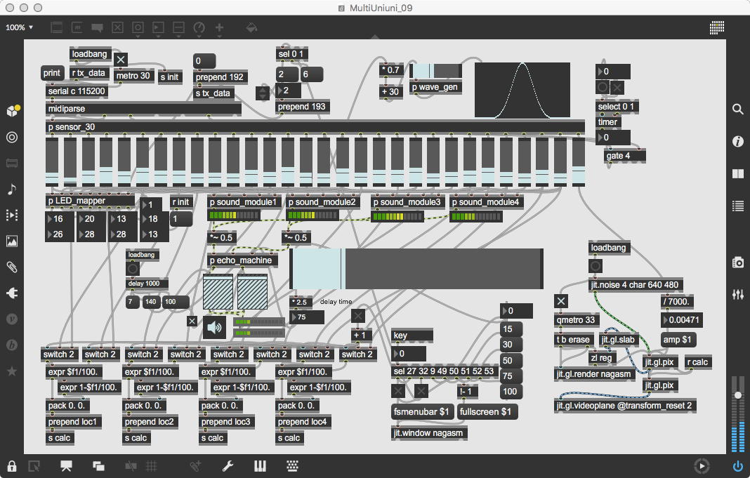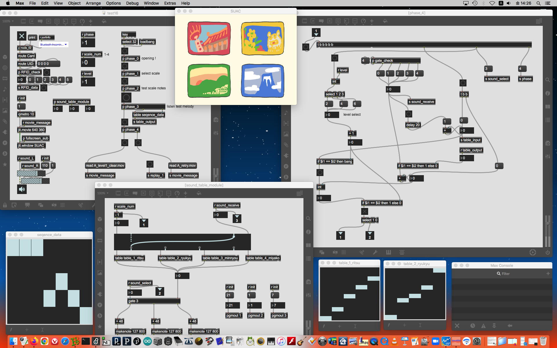 - フォルダ内には、Maxパッチ/Processingスケッチなどから参照される画像・サウンド・動画などのコンテンツも多数ありますが、長嶋でなく学生自身の著作物だったり、実験のためだけに仮に用いた他者の著作物であったものも多数あります