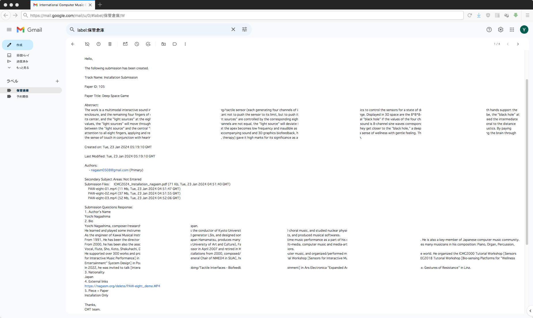 また、当日に何か発表に使えるかもしれない資料として、おそらく未公開のリンクであるが、以下の2つの記録もここに置いておくことにした。 その 第一 は、京都市立芸大の博士論文発表の際に作ったプレゼンで、多くの「自己紹介」や「活動/作品の記録」があるもので、PDFなのに138MBもある。 そして 第二 は去年の音楽情報科学研究会でオンライン発表した時のプレゼンで、こちらにも多くの「自己紹介」や「活動/作品の記録」があり、PDFなのに133MBもある。