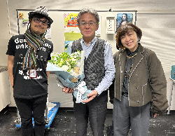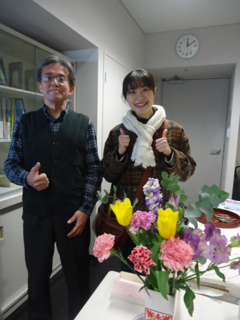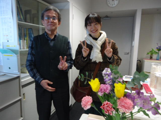 午前には学部長と教員親睦会の2人が1106に来て花束と餞別を受け取ったりして、10時半には河合弘隆氏の葬儀に参列するために帰宅した。 以下の写真は実際には翌日に追加したものだが、藤井先生と中川先生の笑顔に対して、いい感じにシャッターチャンスを外した僕の表情が、捉え方によっては「去りゆく者の哀切」とも取れそうで、これはこれでアリである。