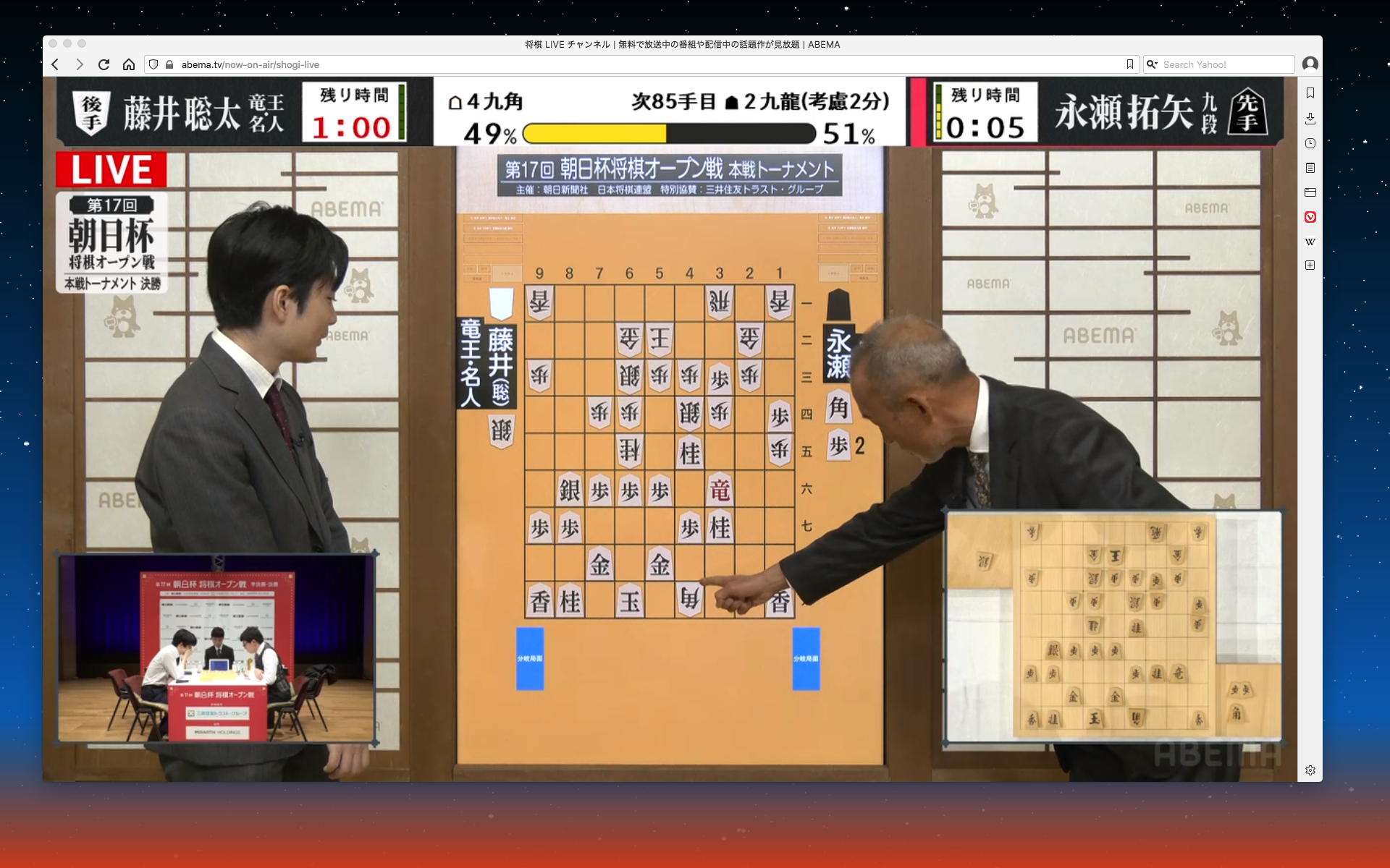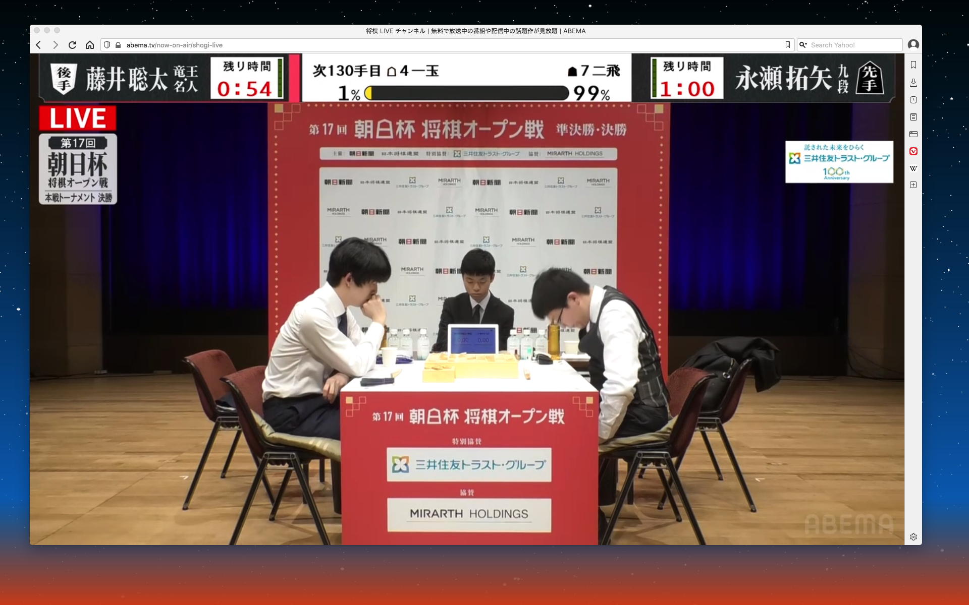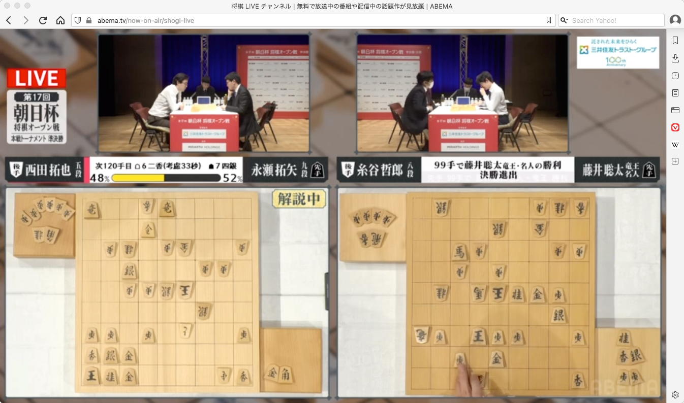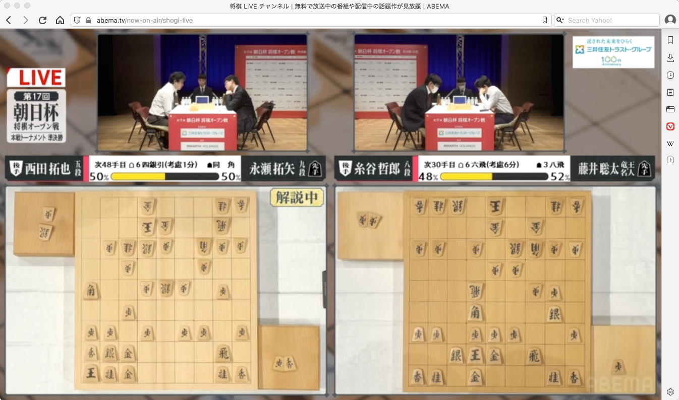 しかし、5対局のウインドウ全てのサウンドをMUTEして、日本のトップのA級棋士(藤井八冠を除く)が対局しているのを同時に見れて、盤面CGも出ていて、さらにAI形勢判断のグラフまで全て出ている・・・というこの風景は、ちょっと昔は考えられなかったことで、実に素晴らしい。 まぁ、嵐が吹き荒れてくるのは「藤井八冠の大盤解説」の午後なのだが、まさにこれまでで最高の、至上のサブモニタ画面(BGV)と言えそうだ。