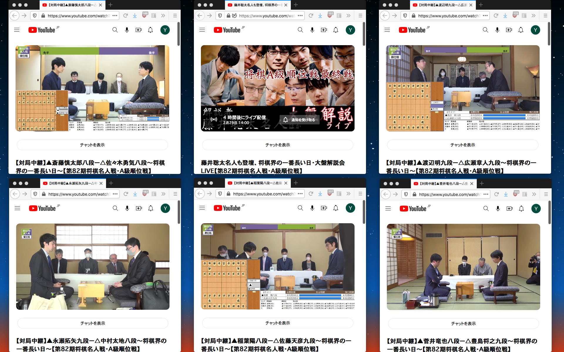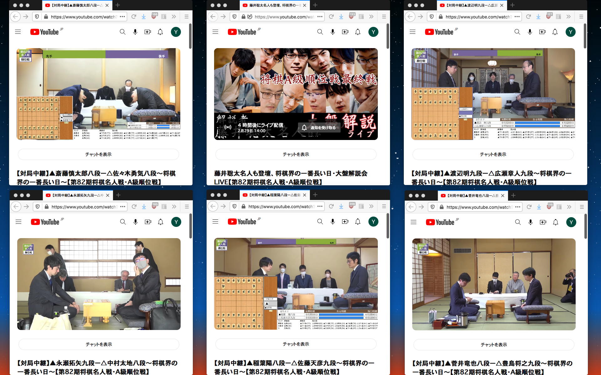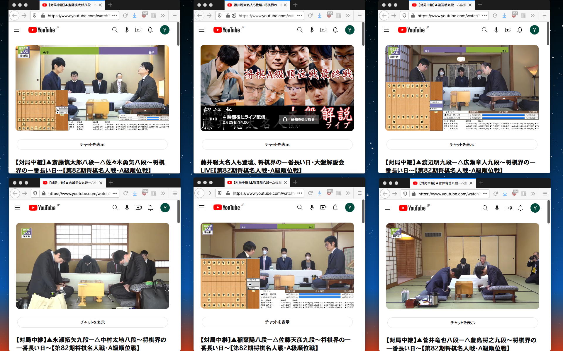 昨日は1月下旬の「おそらくコロナ」のために順延になっていた、「学部事務員+特任助手(実習指導員)」有志との「まねきねこの会」があった。 僕はまず2時間ヒトカラ25曲でウォームアップしてから、再度5人でチェックインして3時間強で12曲(2→1ルール)を全力疾走した。 この日記ではどうも1月の記録を載せていなかったようで、以下がこの1-2月の成果なのだが、東京のスナック/バーとか、卒業生とのフタカラとか、あれこれ充実した感じである。今日は「将棋界の一番長い日」であり、今年は名人戦挑戦者もA級→B級降格者も決まっていない、まさに「全てが決まるのが今日」という盛り上がりで、さらにYouTube解説には藤井八冠が登場するということで、一日中ずっと、以下のようなYouTubeを別画面に置く日となりそうだ。 YouTubeを6画面も開くというのはブラウザにとってもかなり重いらしく、defaultの360pを720pに上げたらCPU温度計は90℃を超えてきた(普段だと40℃ぐらい)が、ここは頑張ってもらおう。