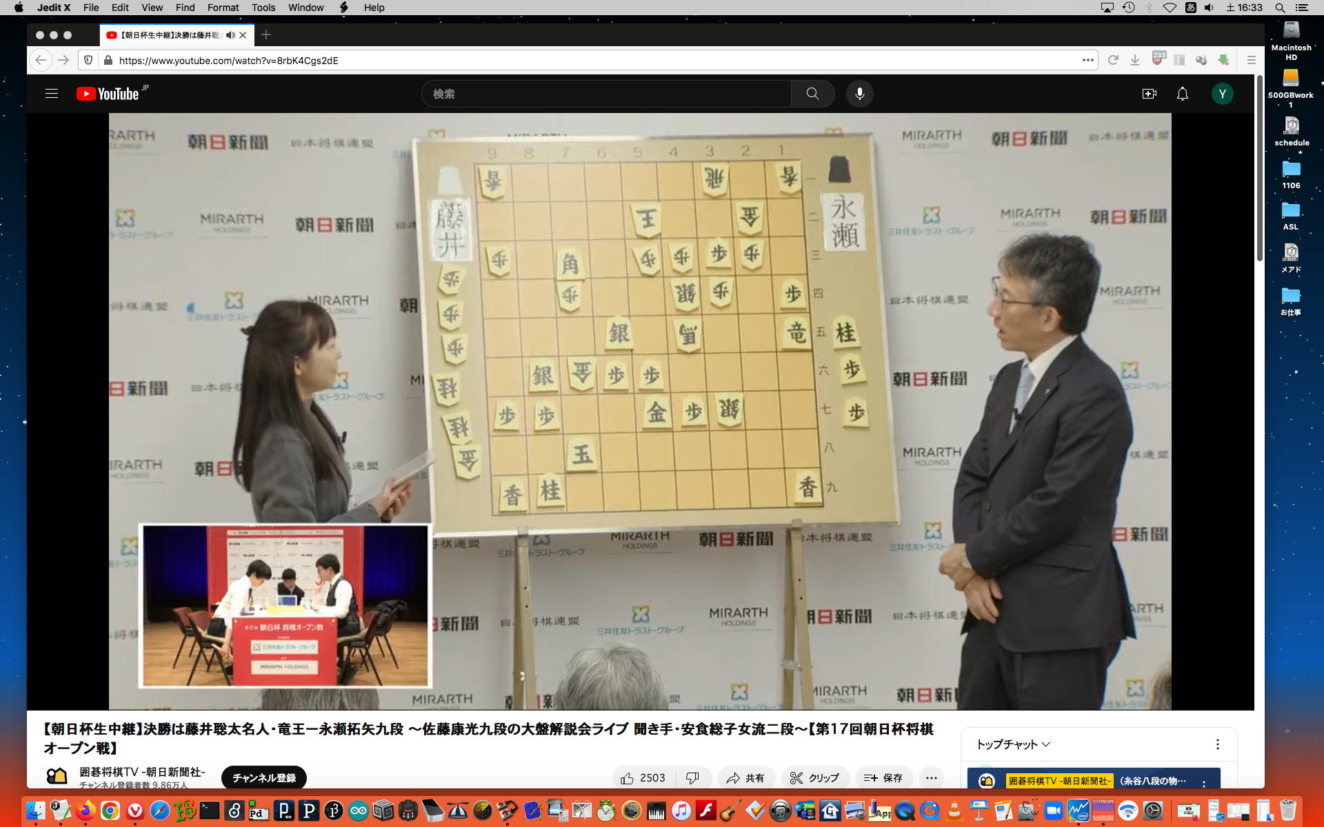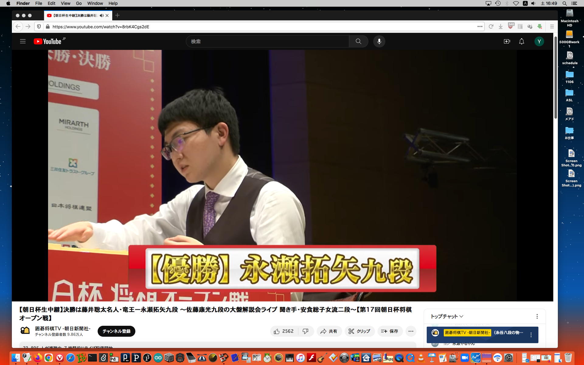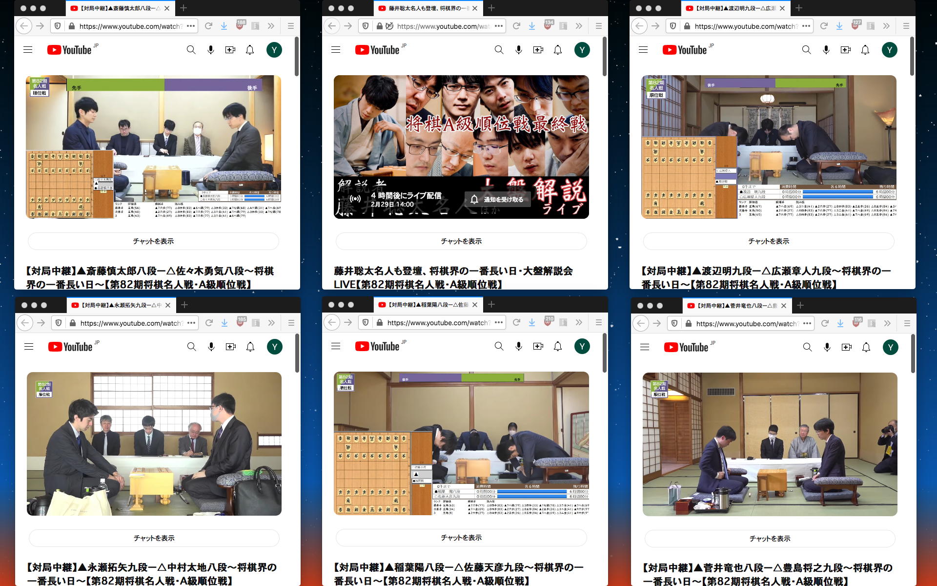 昨日は1月下旬の「おそらくコロナ」のために順延になっていた、「学部事務員+特任助手(実習指導員)」有志との「まねきねこの会」があった。 僕はまず2時間ヒトカラ25曲でウォームアップしてから、再度5人でチェックインして3時間強で12曲(2→1ルール)を全力疾走した。 この日記ではどうも1月の記録を載せていなかったようで、以下がこの1-2月の成果なのだが、東京のスナック/バーとか、卒業生とのフタカラとか、あれこれ充実した感じである。今日は「将棋界の一番長い日」であり、今年は名人戦挑戦者もA級→B級降格者も決まっていない、まさに「全てが決まるのが今日」という盛り上がりで、さらにYouTube解説には藤井八冠が登場するということで、一日中ずっと、以下のようなYouTubeを別画面に置く日となりそうだ。 YouTubeを6画面も開くというのはブラウザにとってもかなり重いらしく、defaultの360pを720pに上げたらCPU温度計は90℃を超えてきた(普段だと40℃ぐらい)が、ここは頑張ってもらおう。
