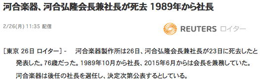 そして今朝の朝刊では、たまたま朝日新聞の全国面の「訃報」欄で発見し、遠州面でも大きな記事になっていたが、河合楽器の河合弘隆社長の訃報に接した。 去年の12月には Final Lecture/Workshop by YN の プレゼン の最後の「謝辞」の中に「KAWAIに感謝」と書いていたところで、これは来月の音楽情報科学研究会(はこだて未来大)の 予稿 の最後にも書いていたところだった。