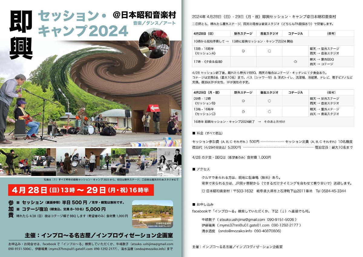 水曜日である。 週2の「Martinに触る日」であり、今日は午後に帰宅してから浜松駅にバスで出かける予定もある。 朝イチで届いていたのは、JASMIM(日本音楽即興学会)会員の名古屋の牛嶋さんからの案内で、僕も去年に初めて このように 参加した、「即興セッションキャンプ」の案内だった(以下のチラシには僕も写っていた)。 去年は即応で参加申し込みしたのだが、今年はまずは棚上げして、ちょっと検討してみることにした。 理由はまぁ、いろいろあるのだ。