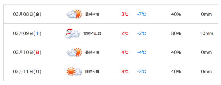 ここで函館の「10日間天気」を見てみると上のように、帰りの3/11を除けば最高気温が2℃から4℃、最低気温は4日間ともマイナス、とかなり寒いことが判明し、さらに「本日の積雪状態」がなんと25〜30cmとのことだった(昨日と今日の2日間だけで38cmの降雪とも)。 能天気に好天の静岡の感覚ではまったくダメで、いつものダウンコートだけでなく、ユニクロの防寒ジーンズと防寒モモヒキ、そしてシューズもスタッドレスの滑らないやつを履いていくことにした。 去年1月の函館では、滑ってちょっと転んでだいぶ痛みが長続きしたので、今回は慎重に行くことにしよう。