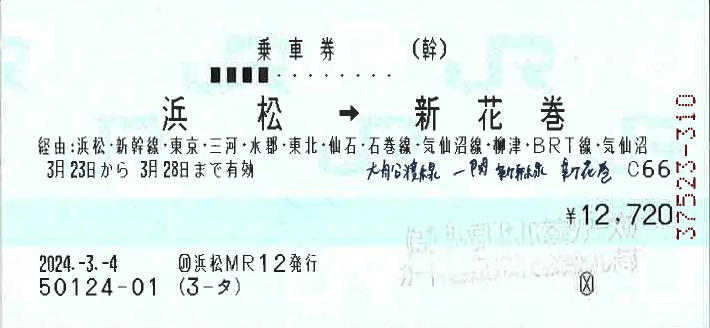 そして午後には浜松駅まで歩いて行き、月末の湯治旅行の切符を購入した。 「みどりの窓口」は予想通りに混んでいたので、向かいのJR東海ツアーズ(旅行社としての営業は今月末までらしい)の「きっぷうりば」に行くと誰も並んでおらずスグにお願いできたが、 切符 を正しく受け取るまでになんと30分以上、かかった。 なんせ上のように、行きの乗車券は東海道新幹線・常磐線・水郡線・東北新幹線・石巻線・気仙沼線・BRT線・気仙沼線・東北新幹線と経由するという無理難題であり(^_^;)、東海道新幹線→東北新幹線であれば10,670円のところあれこれ迂回しつつ一筆書きで12,720円となっているのだ。 帰りの乗車券も仙台から東京まで常磐線をずっと経由するので11,000円だった。 売り場のお姉さんが最初に入力してみると「経由地が多すぎて発券できず」というエラーで振り出しに戻ったりしたので、この時間は想定の範囲内だった。 僕が窓口で渡したのは この紙 だけであり、プロであればこんなのはまずまず単純な方だと思う。