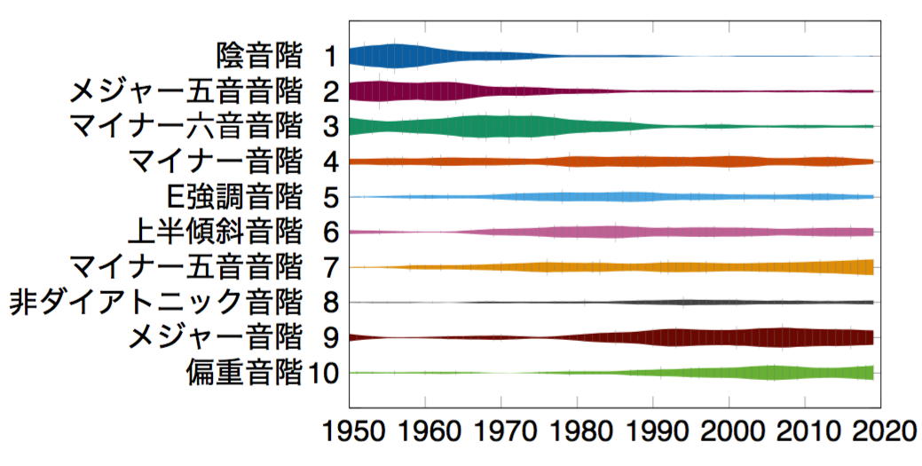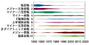 まず最初に検討したのは、「2. 創作知識の進化モデルに基づく作曲スタイルの変遷過程の分析」という研究で、クラスター分析で日本のポピュラー音楽のメロディーのスタイル(旋法)の変遷を分析しよう・・・という意欲的な研究である。 「1950年以降のレコード売上ランキングおよびオリコンの年間チャートの50位以内に含まれる3198曲(リリース年は1949〜2019年)のうち1960年以降の期間に属する2934曲」を対象として、「MusicXML形式の電子楽譜データ(転調を含む)にある調号の情報をもとに、各曲を自然調に移調した上でメロディーの音高系列を抽出」したものであるという。