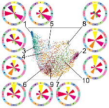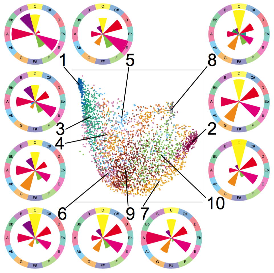 僕が興味を持ったのは、その本体部分でなく、まずは上(上)のように10種類の「音階」にスタイルクラスターを分類しているという「準備段階」の部分で、まずは「○○音階」とだけ名付けられている、そのピッチクラスを確認したかったのである。 本文中には、上の4つだけしか解説が無かったのだが、上(下)の図を拡大してみるとようやく傾向が分かって(Cの黄色が見えにくいのはちょっと残念)、以下のように10種類の「音階」が定義されていることが確認できた。・E強調音階:高頻度で E を用いるスタイル ・上半傾斜音階:ABCDE の音を主に使うスタイル ・非ダイアトニック音階:ダイアトニック音階から外れた音を比較的に多く用いるスタイル ・偏重音階:CDEG の音を主に使うスタイルここから提起されるのは、マイナーとメジャーのスケールに関する音楽学的な立場で、Tonal Centerとして「メジャーはC、マイナーはAを採用する」か、「メジャーもマイナーもCとする」か、というあの議論である。 マイナーもCとすれば、音階1/3/4/6/7については短3度だけ上げて移調して、例えば1の陰音階であれば「C-D-Eb-G-Ab」としなければならない。 ブルーノートなどを視野にいれる場合には絶対に後者を採用した方がスケールの変化の歴史的影響などを考える場合に有効なので、ここはやはり質問しておきたい点となった。 また、マイナーのスケールというのは3種類(Natural Minor, Harmonic Minor, Melodic Minor)それぞれで、上行と下行の場合に音高が臨時変化するものがあるので、クラスター分析の過程で上下ぐしゃっとまとめてしまう事の妥当性についても質問したい気になった。