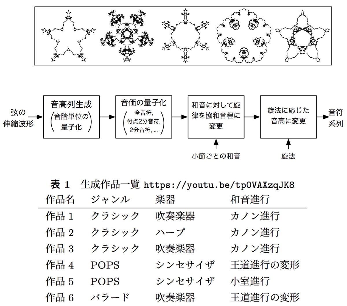 次に検討したのは、「6. スピログラフ図形に基づく音楽生成」と「7. 二重振り子の動きを利用した音楽生成の試み」という研究(同一研究者)で、過去の広島工大での音楽情報科学研究会では「山脈の稜線に基づく音楽生成」みたいなものがあったやつの発展系?のようだ。 要するにマッピングの問題であり、スピログラフであろうが二重振り子であろうが、「数学的な規則に基づいて時間的に変化する量」をまず生成して、そこからマッピングによって音楽を生成するという古典的なアプローチである。 ただし本研究では、以下のように実装しているので、どのようなものであっても音楽的に破綻しない、ちゃんと「聞ける」音楽が生成される。 YouTubeに上がっていたデモは これ と これ だった。