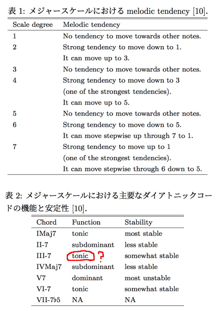 次に検討したのは、「10. VAEを用いたバリエーション生成による共創的作曲システム」だったが、これはどうも理解しきれなくて、質問する内容をまとめきれなかったので、当日の現場勝負と決めた。 その次に検討したのは、「19. ジャズ理論に基づく和音間の仮想的引力モデルとそのリハーモナイゼーションへの応用」である。 こちらも研究の結果に関するようなレベルではない素朴な疑問なのだが、ただし「本稿ではジャズ理論の代表として The Berklee Book of Jazz Harmony [10] を一貫して参照する」とあるので、おそらく間違いではないので困ったのである。 これも何度となく議論してきたことなのだが、表の中の「Em7はtonic機能」という部分が悩ましいのだ。 ただしこの部分は基礎(前提)なので、ここが別意見のように「dominant」機能となっていると、ここから後の議論やリハーモナイズの成績まで大きく変わってしまう、という意味ではとても重要だ。 ここはまぁ、懇親会でちょっと愚痴ってみて、誰かが聞き付けたら深めていく・・・という路線を採用することにした。