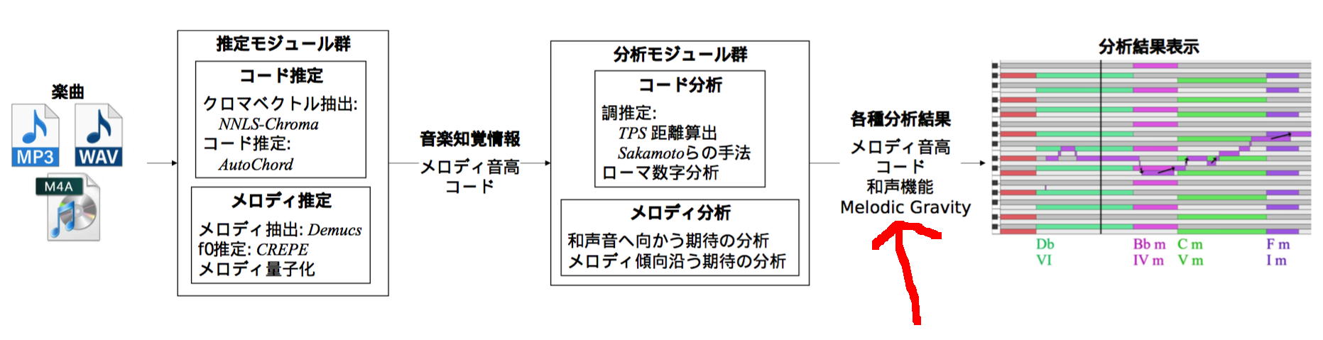検討の最後は、片寄研らしい研究の「ポップスのMelodic Gravityの可視化 - IRMと GTTM の相補的利用による階層的暗意実現の計算モデル」である。 上のように全体は整然と立派なシステム構成であり、その中で出てくる「Melodic Gravity」というのが興味の対象である。 僕の「Dominant Motion理論」とかなり感覚的に近いものだというのが第一印象なのだ。 この単語は英語版Wikipediaでも出てこなかったので、予稿に従って Dr. Capital に行ってみたが、「『Dr. Capital の音楽チャンネル』の中で取り上げられたmelodic gravityがある」と書かれているものの、それがどこなのか発見できなかった(;_;)。 こうなると、言葉として「Melodic Gravity」というのは賛同できるし興味があるものの、本研究のようにNarmourのImplication Realization Model(IRM)の枠組みでこれを捉えるのが妥当かどうか、は立場によって意見が分かれそうである。 staticなharmonyとしてだけでなく、時系列としてメロディーの動きにもMelodic Gravityを仮定するというのが本研究の立場だが、僕としてはIRMに深入りすることは避けて、暇にあかせてネットを探索してみようか。