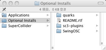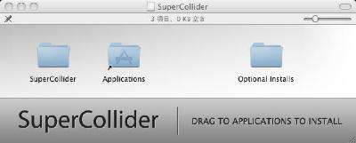 昼過ぎまで教授会や委員会があったが、翌日が入試ということで午後は入構制限となって静かになったので、 まずは環境設定から開始した。 まずは SuperCollider のサイトに行った。 ダウンロードページ から、「SuperCollider3.4-with-extras-10.6」をダウンして解凍してみると、以下のようになった。
