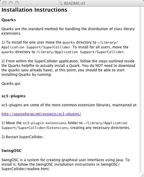 そしてこの中の「README.rtf」を読むと、以下のようになっていた。 さすが、歴史があるだけに、いろいろ拡張されているようで、ややこしい(^_^;)。 とりあえず、言われるように、「quarks」と「sc3-plugins」と「SwingOSC」とを、指定された場所にフォルダを作ってコピーした。