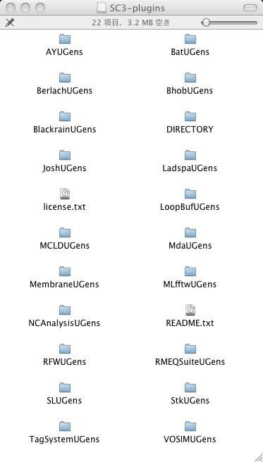 「SuperCollider plugins provide additional synthesis (and other) capabilities to the server - i.e. new types of sound source, filter, etc.」とあるので、とりあえずこれらのプラグインを入れない手はないので、リンク先の ここ から「SC3ExtPlugins2010-09-03.dmg」をダウンロードして解凍すると以下のようなものがあった。 この中身を、たぶんdefaultでパスが通っていると信じて、「plugins」フォルダの下にコピーした。