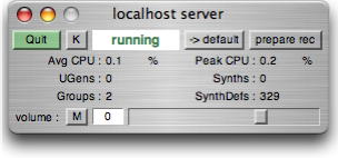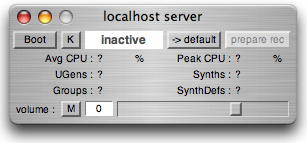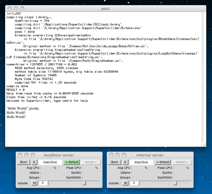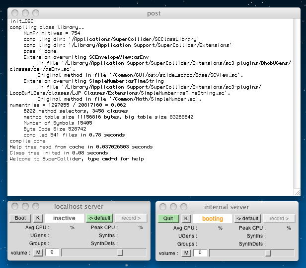 とか( "Hello World!".postln; "Hello SC!".postln; ) とか("Hello World!".postln; "Hello SC!".postln;) になるが、いずれもOKである。 なお、後では中カッコ { } とかカギカッコ [ ] が主役になるので注意が必要である。( "Hello World!".postln; "Hello SC!".postln; ) 昔のSuperColliderであれば、単独のアプリだったので、ここでサウンドを記述する1行を入れて「enter」キーが出たが、SuperCollider3になってサーバシステムとなったので、まず準備が必要になった。 謎だった、以下のウインドウの出番である。