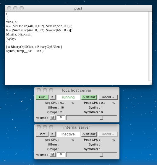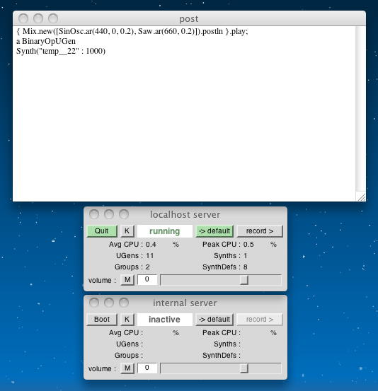 を実行させてみると、確かにモノラルで こんな音である。 postウインドウの表示は以下のようになった。{ Mix.new([SinOsc.ar(440, 0, 0.2), Saw.ar(660, 0.2)]).postln }.play; これに対して、