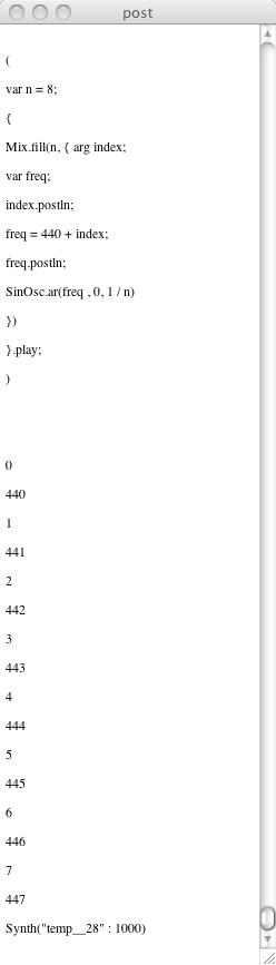 で見てみると、実行したサウンドは こんな音で、 postウインドウの表示は以下のようになった。 なるほど、nが8、と指定すると、ちゃんとn=0からn=7までやっている。( var n = 8; { Mix.fill(n, { arg index; var freq; index.postln; freq = 440 + index; freq.postln; SinOsc.ar(freq , 0, 1 / n) } ) }.play; )
