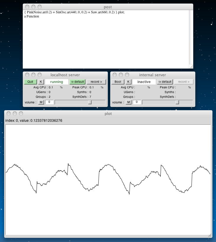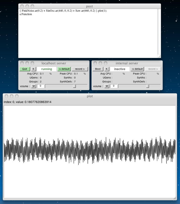 を実行させてみると、 こんな音になった。 実質的に1行でサインぐらいしか見当たらないシンプルな記述なのに、である。 このプログラムでは、nが8ということで、ピッチにランダム要素を加味した8個のサインが再帰的にミックスされているのである。( var n = 8; { Mix.fill(n, { SinOsc.ar(500 + 500.0.rand, 0, 1 / n) }) }.play; ) この様子を、postウインドウに状況を表示するサンプル
