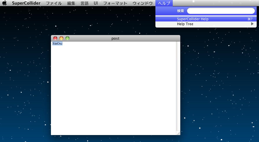 さらに「Getting Help」のページでは、オブジェクト指向言語であるSuperColliderについて、「Classes and Methods」という解説がある。 ここには、登場する色々なクラスのヘルプを呼び出すには「Cmd - d」だ、と書いてあるが、どうもうまく出なかった。 ただし、postウインドウ内に置いたクラス名をダブルクリックなどでハイライトさせて、メニューの「ヘルプ」から「SuperCollider Help」を指定すると、それぞれのヘルプが以下のように出ることがわかった。これで十分だろう。