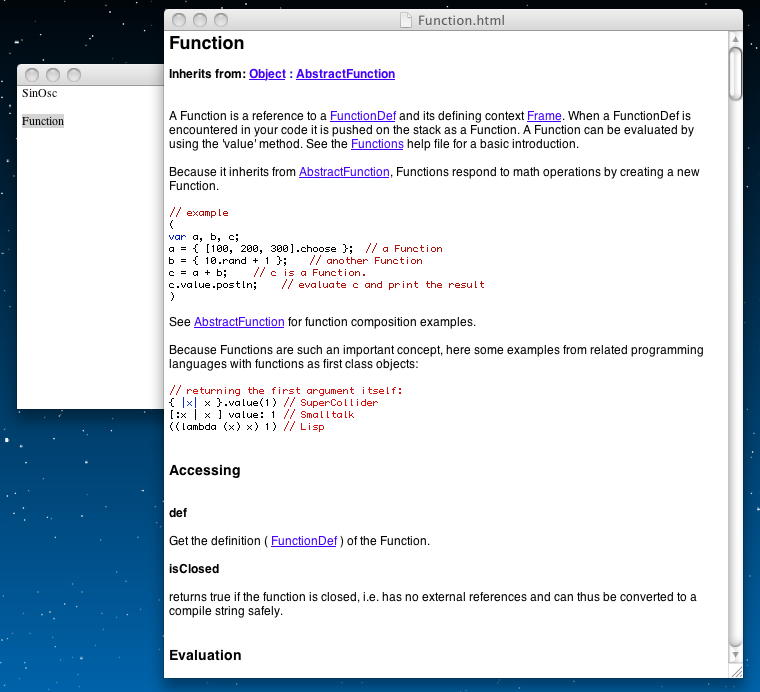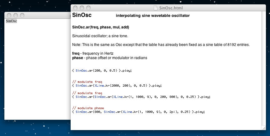 というプログラムをコピペして「enter」キーにより、2ヘルツの唸りのある440Hzのサインが鳴り出し、ずっと続いた。 こんな音である。{ [SinOsc.ar(440, 0, 0.2), SinOsc.ar(442, 0, 0.2)] }.play; ただし、チュートルアルはこの後、関数 Funcction の解説が延々と続くので、サウンドはしばしお預けとなった。 ここは、