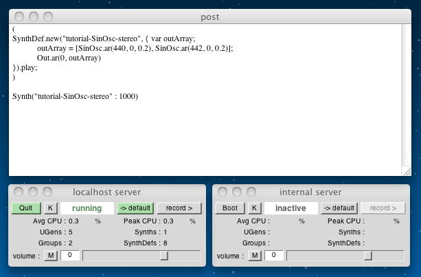 ( SynthDef.new( "tutorial-SinOsc-stereo", { var outArray; outArray = [SinOsc.ar(440, 0, 0.2), SinOsc.ar(442, 0, 0.2)]; Out.ar(0, outArray) } ).play; ) ![]()