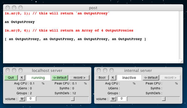 In.ar(0, 1); // this will return 'an OutputProxy' In.ar(0, 4); // this will return an Array of 4 OutputProxies ![]()