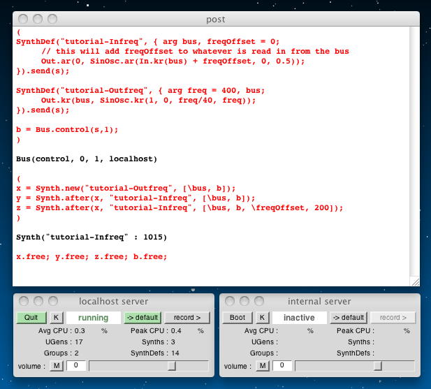 ( SynthDef( "tutorial-Infreq", { arg bus, freqOffset = 0; // this will add freqOffset to whatever is read in from the bus Out.ar(0, SinOsc.ar(In.kr(bus) + freqOffset, 0, 0.5)); } ).send(s); SynthDef( "tutorial-Outfreq", { arg freq = 400, bus; Out.kr(bus, SinOsc.kr(1, 0, freq/40, freq)); } ).send(s); b = Bus.control(s,1); ) ( x = Synth.new("tutorial-Outfreq", [\bus, b]); y = Synth.after(x, "tutorial-Infreq", [\bus, b]); z = Synth.after(x, "tutorial-Infreq", [\bus, b, \freqOffset, 200]); ) x.free; y.free; z.free; b.free; ![]()