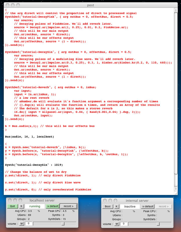 ちょっと長いが、最後のサンプルは以下である。 まず、最初の「( )」グループをハイライトしてenterで送るとSynthDefとバスが定義され(メソッド)、次の「( )」グループをハイライトしてenterで送ると実際にインスタンスが生成されてサウンドが鳴る。 ピンクノイズとサインにそれぞれリバーブがかかった、 こんな音である。 「Change the balance of wet to dry」に続く1行目の行末にカーソルを置いてenterすると、ピンクノイズのリバーブが消えて、 こんな音になる。 これに続く2行目の行末にカーソルを置いてenterすると、さらにサインのリバーブが消えて、 こんな音になる。 サウンドを消す時には最後の行末にカーソルを置いてenterである。