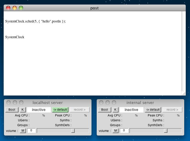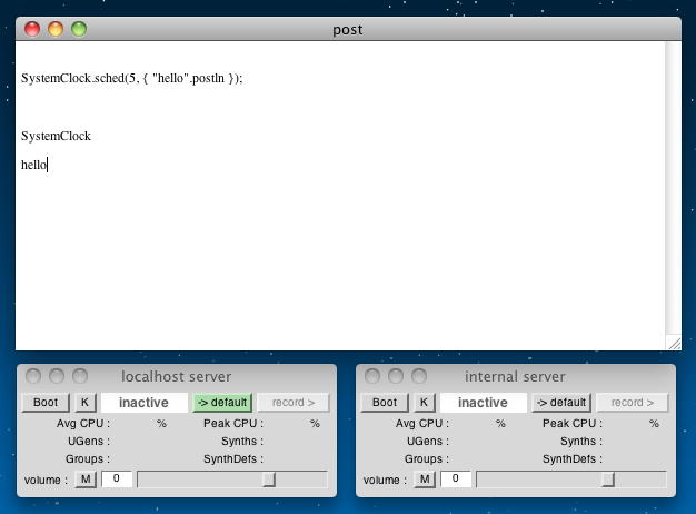 を実行させると、直後にはSystemClock.sched(5, { "hello".postln });