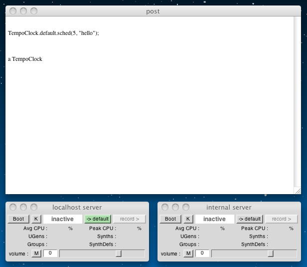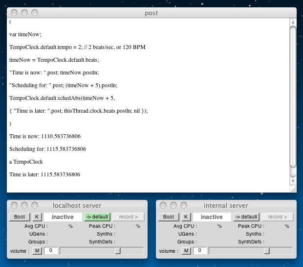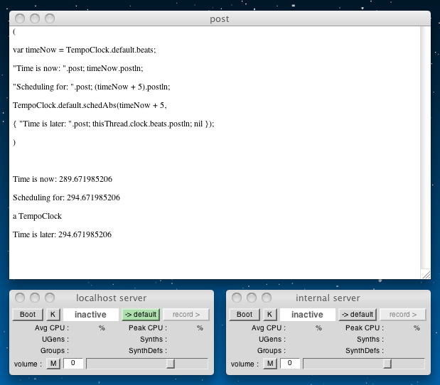 ( var timeNow; TempoClock.default.tempo = 2; // 2 beats/sec, or 120 BPM timeNow = TempoClock.default.beats; "Time is now: ".post; timeNow.postln; "Scheduling for: ".post; (timeNow + 5).postln; TempoClock.default.schedAbs( timeNow + 5, { "Time is later: ".post; thisThread.clock.beats.postln; nil } ); )