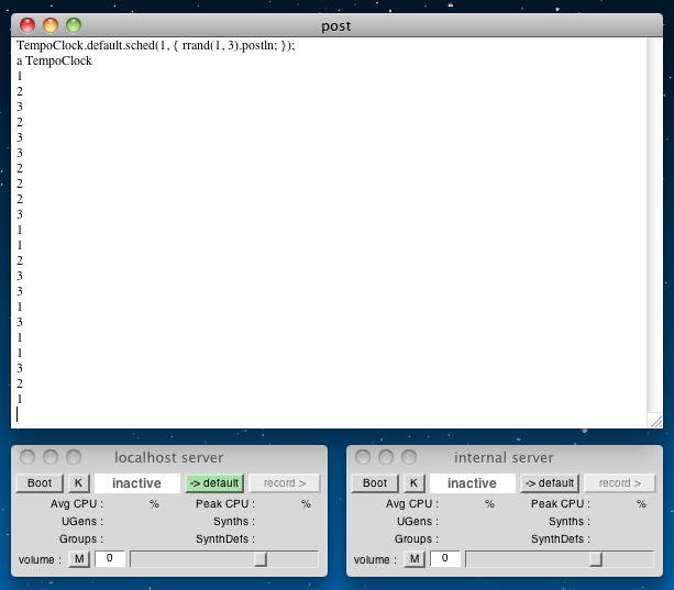 これは当然である。 「TempoClock.default.sched(5, "hello")」の第2引数の「"hello"」はデータである。 スケジューリングとしては、ここに何らかのアクション、つまり