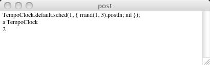 // fires many times (but looks like it should fire just once) TempoClock.default.sched(1, { rrand(1, 3).postln; });