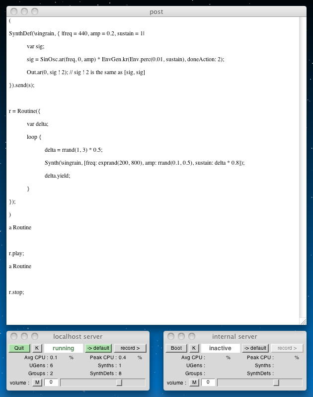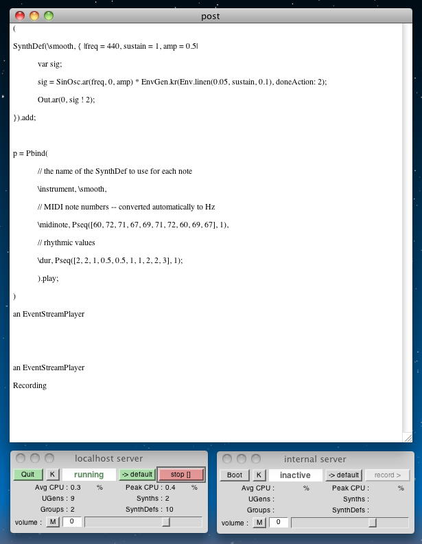 ちょっと長くなってきたが、さすがにSuperColliderらしい、いい音がした。これは楽しみだ。 ちなみに、これを鳴らしている最中に、メイル到着を知らせるメイラのデーモンがサウンドファイルを鳴らそうとしたらしく、途中でSuperColliderからのサウンドが変化してしまった。SuperColliderのサウンド生成サーバも、よりpriorityの高いプロセスとサウンドリソースの取り合いとなれば負けることが判ったので、実際にサウンド生成する作品などの場合には注意することにしよう。