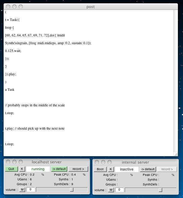 「routine」では、音楽の用途には限界がある。 いったん「routine」を止めた場合には、もう一度、最初から呼び出さないといけない。 音楽では「ポーズ」と「再スタート」が一般的であり、このためにあるのが「task」である。 以下の例では、「t = Task({・・・」として無限ループのダイアトニックスケールをピッチにmidiを使って発生し、 「t.stop;」でいったんポーズで停止し、「t.play;」でその続きから再開している。 こんな音になった。