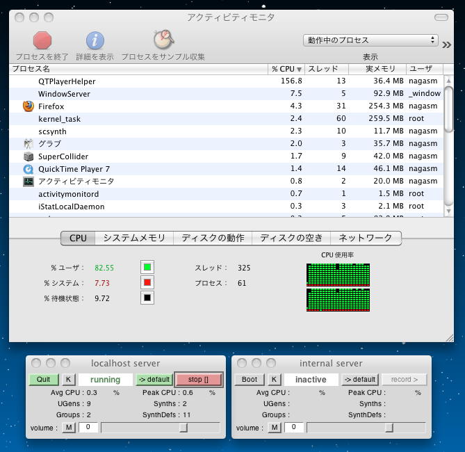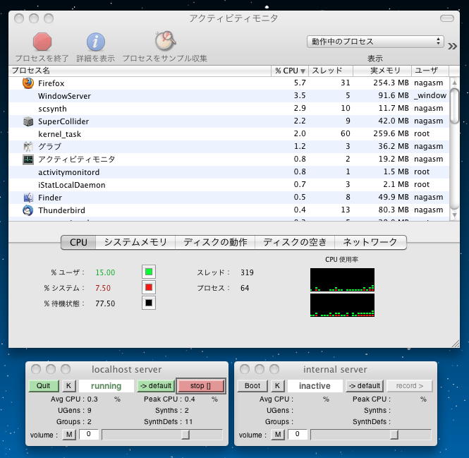 しかしこのサウンドは こんな音で、ばらつきは感じられない(^_^;)。 アクティビティモニタで見てみると、以下のようにCPUはほとんど暇だから仕方ないのか。( t = Task( { loop { Synth( \singrain, [ freq: exprand(400, 1200), sustain: 0.08 ] ); 0.1.wait; } } ).play; ) t.stop;