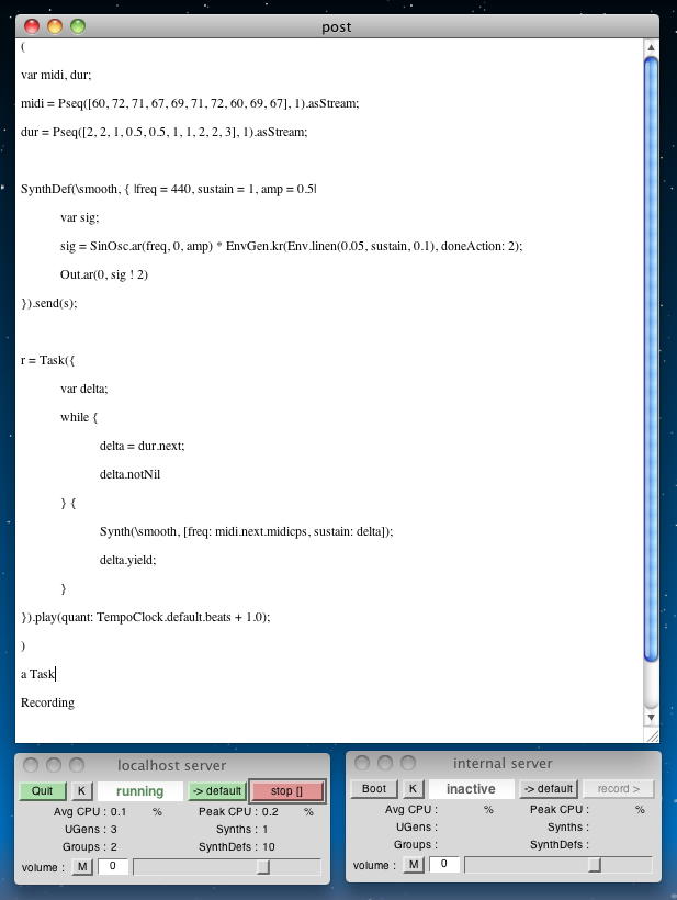 「Pseq (Pattern-sequence)」を使うと、同じように、以下のようになる。r = Routine( { [60, 72, 71, 67, 69, 71, 72, 60, 69, 67].do( { |midi| midi.yield } ); } ); while { (m = r.next).notNil } { m.postln }; 60 72 71 67 69 71 72 60 69 67 nil これを用いると、「Over the Rainbow」のメロディーを生成するSuperColliderプログラムは以下のようになる。 こんな音がする。p = Pseq([60, 72, 71, 67, 69, 71, 72, 60, 69, 67], 1); r = p.asStream; while { (m = r.next).notNil } { m.postln }; 60 72 71 67 69 71 72 60 69 67 nil ( var midi, dur; midi = Pseq( [60, 72, 71, 67, 69, 71, 72, 60, 69, 67], 1 ).asStream; dur = Pseq( [2, 2, 1, 0.5, 0.5, 1, 1, 2, 2, 3], 1 ).asStream; SynthDef( \smooth, { |freq = 440, sustain = 1, amp = 0.5| var sig; sig = SinOsc.ar(freq, 0, amp) * EnvGen.kr( Env.linen(0.05, sustain, 0.1), doneAction: 2 ); Out.ar(0, sig ! 2) } ).send(s); r = Task( { var delta; while { delta = dur.next; delta.notNil } { Synth( \smooth, [ freq: midi.next.midicps, sustain: delta ] ); delta.yield; } } ).play( quant: TempoClock.default.beats + 1.0 ); )