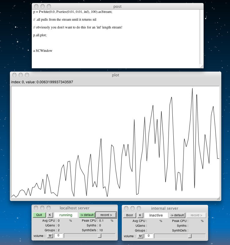 p = Pwhite( 0.0, Pseries(0.01, 0.01, inf), 100).asStream; // .all pulls from the stream until it returns nil // obviously you don't want to do this for an 'inf' length stream! p.all.plot; ) t.stop;