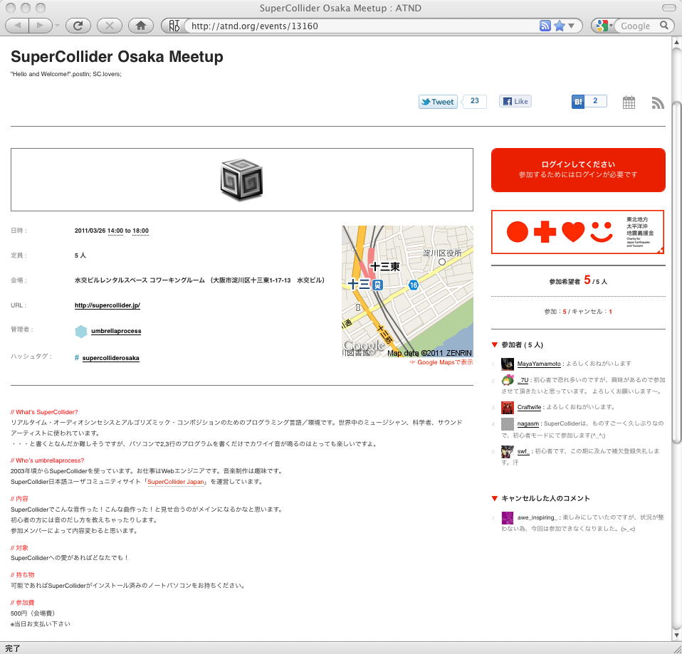 今日は、SUACとしては初めてとなる「国公立入試」の日なので、時間はほとんど取れず、何も進まず。(^_^;)ただし、 SuperCollider のページにあるリンクからたどり着いた、 SuperCollider Osaka Meetup のページに、無謀にも参加登録してみたが、ここで参加する クラフトワイフ というところに、なんと、麗しきタケコさん発見(^_^)。 これは楽しみになった。 というか、ちゃんとモノにしないと。(^_^;)