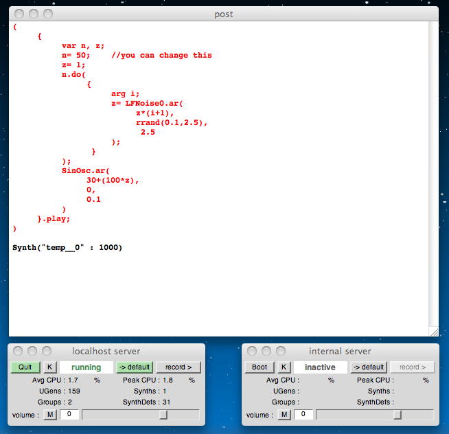 以下は「UGen network」が関数(fubction)を生成している例である。 サウンドを生成している部分はこれ以上ない単純なサイン関数である。 その周波数パラメータの部分に、「ホワイトノイズにランダムのカットオフ周波数をかけたものを50個乗算」する、 という要素を作用させただけで、かなり複雑な こんな音がした。