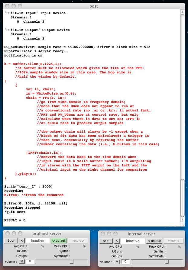 s = Server.local.boot; b = Buffer.alloc(s,1024,1); //a buffer must be allocated which gives the size of the FFT; //1024 sample window size in this case. The hop size is //half the window by default. ( { var in, chain; in = WhiteNoise.ar(0.8); chain = FFT(b, in); //go from time domain to frequency domain; //note that the UGen does not appear to run at //a conventional rate (no .ar or .kr); in actual fact, //FFT and PV_UGens are at control rate, but only //calculate when there is data to act on; IFFT is //at audio rate to produce output samples //the output chain will always be -1 except when a //block of fft data has been calculated; a trigger is //then sent, essentially by returning the buffer //number containing the data (i.e., b.bufnum in this case) [IFFT(chain),in]; //convert the data back to the time domain when //input chain is a valid buffer number; I'm outputting //in stereo with the IFFT output on the left and the //original input on the right channel for comparison }.play(s); ) b.free; //frees the resource