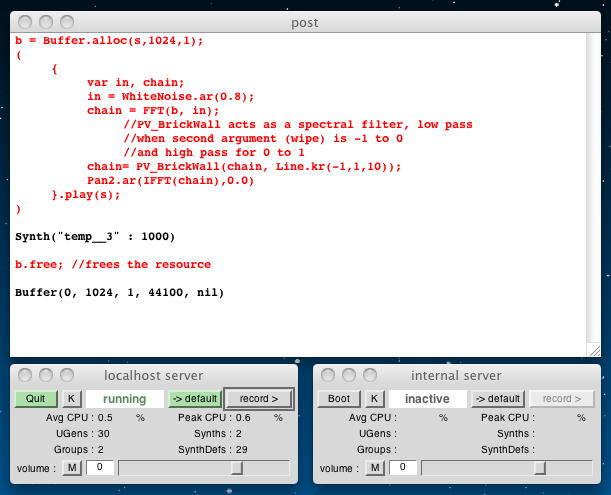 s = Server.local.boot; b = Buffer.alloc(s,1024,1); ( { var in, chain; in = WhiteNoise.ar(0.8); chain = FFT(b, in); //PV_BrickWall acts as a spectral filter, low pass //when second argument (wipe) is -1 to 0 //and high pass for 0 to 1 chain= PV_BrickWall(chain, Line.kr(-1,1,10)); Pan2.ar(IFFT(chain),0.0) }.play(s); ) b.free; //frees the resource