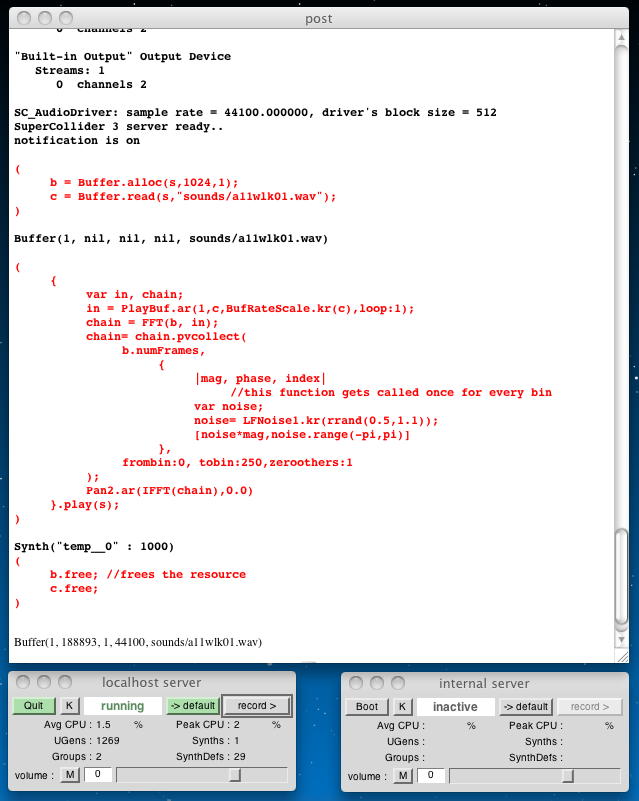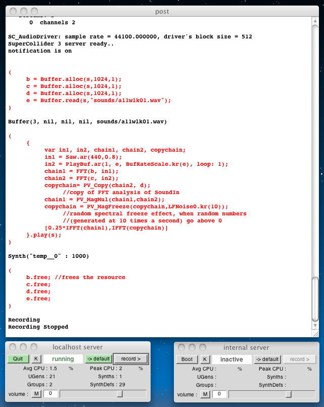s = Server.local.boot; ( b = Buffer.alloc(s,1024,1); c = Buffer.alloc(s,1024,1); d = Buffer.alloc(s,1024,1); e = Buffer.read(s,"sounds/a11wlk01.wav"); ) ( { var in1, in2, chain1, chain2, copychain; in1 = Saw.ar(440,0.8); in2 = PlayBuf.ar(1, e, BufRateScale.kr(e), loop: 1); chain1 = FFT(b, in1); chain2 = FFT(c, in2); copychain= PV_Copy(chain2, d); //copy of FFT analysis of SoundIn chain1 = PV_MagMul(chain1,chain2); copychain = PV_MagFreeze(copychain,LFNoise0.kr(10)); //random spectral freeze effect, when random numbers //(generated at 10 times a second) go above 0 [0.25*IFFT(chain1),IFFT(copychain)] }.play(s); ) ( b.free; //frees the resource c.free; d.free; e.free; )