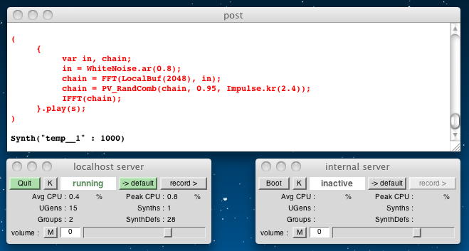 s = Server.local.boot; ( { var in, chain; in = WhiteNoise.ar(0.8); chain = FFT(LocalBuf(2048), in); chain = PV_RandComb(chain, 0.95, Impulse.kr(2.4)); IFFT(chain); }.play(s); )