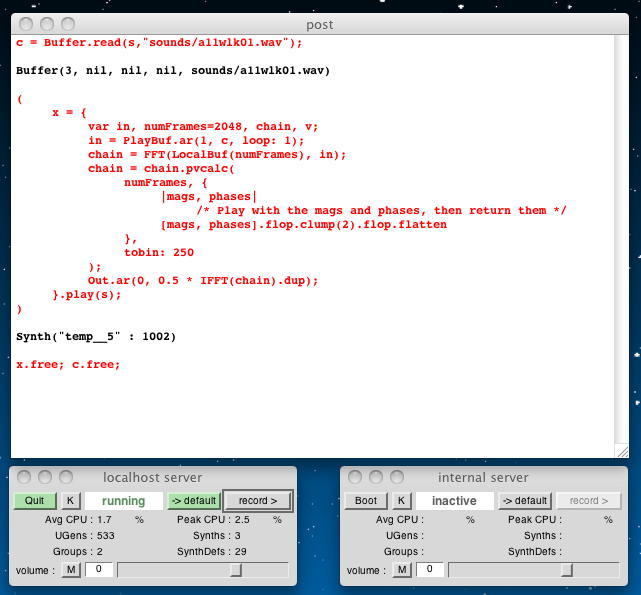 さて、この週は「嵐の前の静けさ」というのか、この日の午後の教授会(入試判定、卒業判定)の他に、予定がまったく無い。 2012年の後半の国際会議についても、あとはSMCに応募するだけ、と比較的、追い込まれていない。 来週には、月曜日に後期入試(学科定員5人のところに110人の応募があった(^_^;))で4時間の実技監督と多数の面接、 そして間髪を入れずに卒業式である。 新学期に向けて、色々な仕込みをしている合間を縫って、FFTを進めていこう。次のサンプルは「example 3 Multiple PV UGens across two chains!」である。 多重のフェーズボコーダ(PV)をUGensで作るサンプルで、FFTを「chain」を介して接続するものらしい。 ソースを見ると、サウンド入力「SoundIn」があったが、お仕事Macは何も繋がっていない(^_^;)。 そこで、過去のページから発掘して、以下のように、 いつものサウンドファイルを再生するようにアレンジしてみると、 こんな音がした。